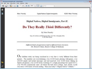 The document discusses using technology to enhance academic advising for modern students. It notes that today's students, known as "digital natives," have grown up with technology and think and process information differently than previous generations. The document suggests advisors, known as "digital immigrants," can integrate inexpensive technologies like email, websites and mobile apps to better connect with students. It provides examples of technologies and activities for advisors to discuss how technology could improve their advising practices.