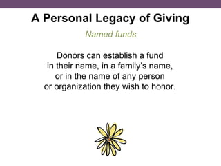 The document discusses various tools and methods for charitable giving through community foundations, including establishing named funds, unrestricted funds, field of interest funds, and designated funds. It provides details on donor advised funds, comparing them to private foundations. The document also discusses charitable instruments like outright gifts, bequests, gift annuities, charitable lead trusts, and charitable remainder trusts. It focuses on how financial advisors can have conversations with clients about charitable giving opportunities related to their financial situations and goals.