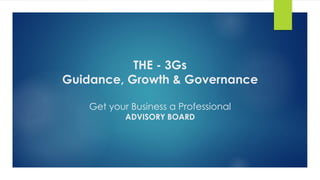 The document discusses advisory boards and their role in providing guidance, growth, and governance to businesses. An advisory board is an informal group of professionals that advises executive management on strategic issues. Unlike a board of directors, an advisory board does not have voting power or legal responsibilities. The advantages of an advisory board include strategic advice, a 360-degree perspective, overseeing strategic execution, and risk assessment. Advisory boards can guide businesses through different growth stages, improve operations, explore new strategies and markets, and ensure good corporate governance practices.