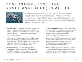 - Governance, risk and compliance services such as internal audits, IT audits, risk management, and fraud assessments.