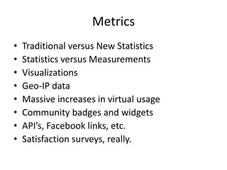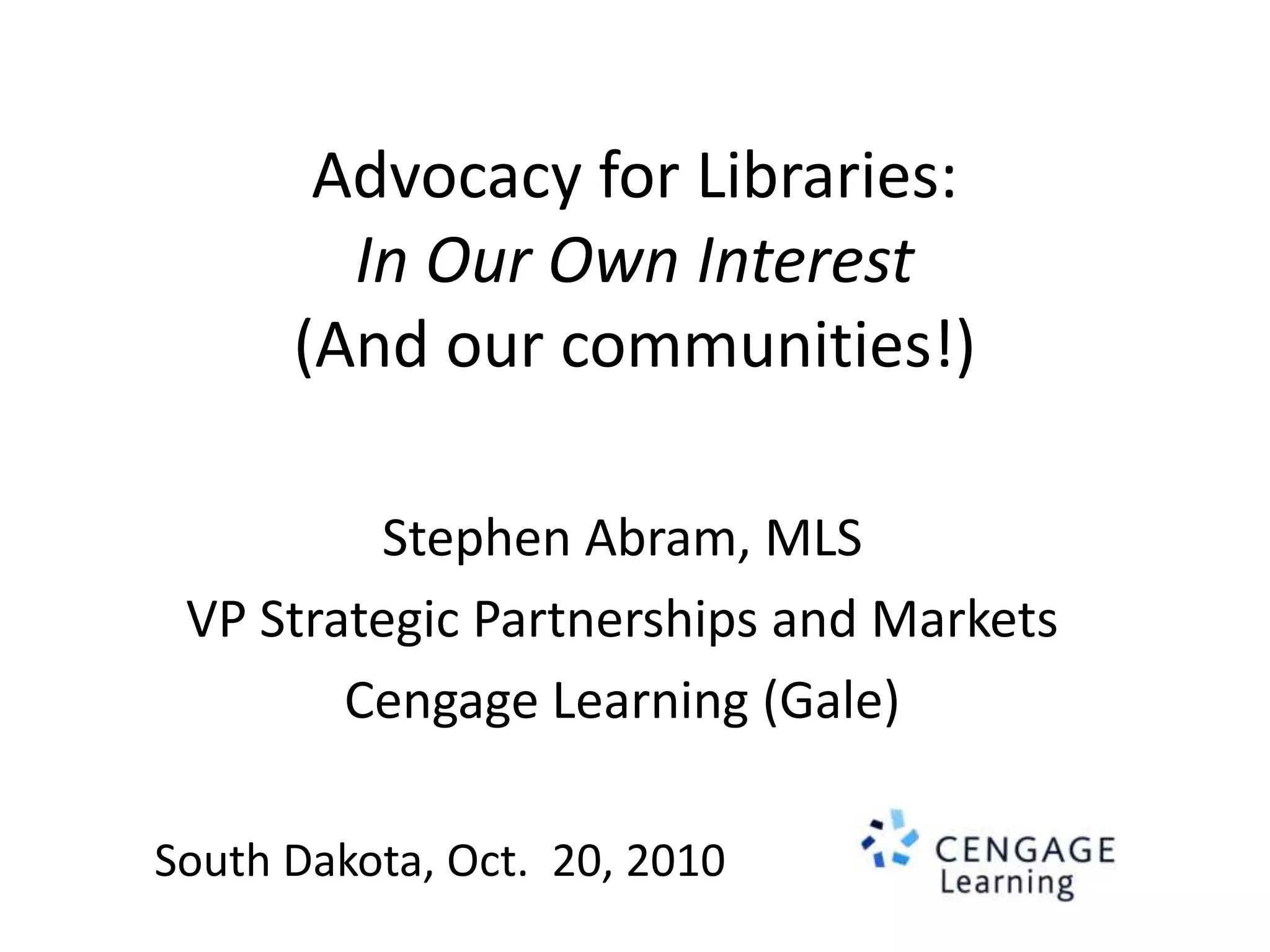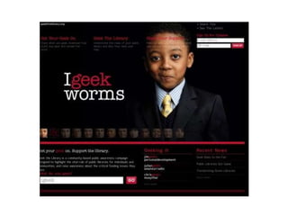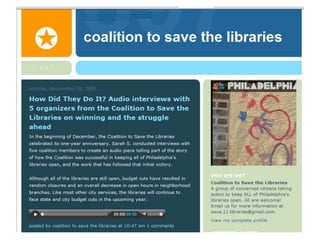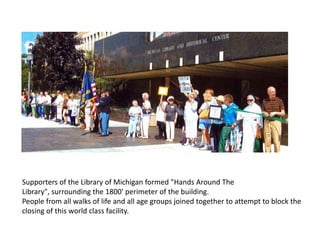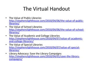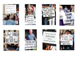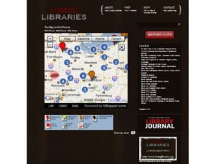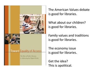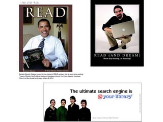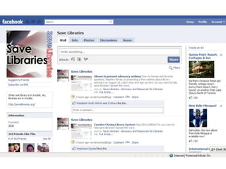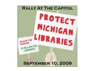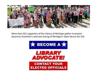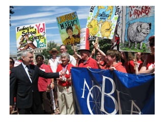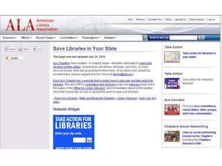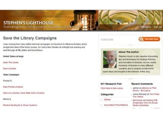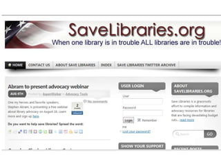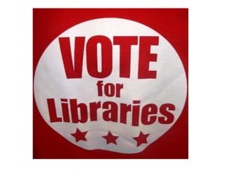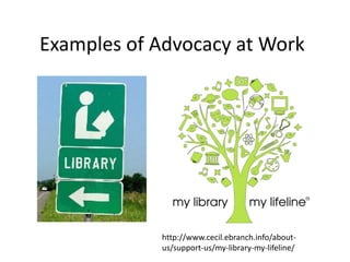 This document discusses advocacy strategies for libraries. It defines advocacy as marketing an issue to build support incrementally through planned efforts. Effective advocacy requires understanding your target audiences and having a passionate spokesperson who can tell compelling stories with proofs. Visual elements that stand out are important for gaining attention. Metrics should measure more than just traditional statistics. Examples of successful advocacy campaigns involve community engagement activities that demonstrate the value libraries provide. The overall message is that advocacy requires strategic, creative, and ongoing efforts to influence perceptions and support for libraries.