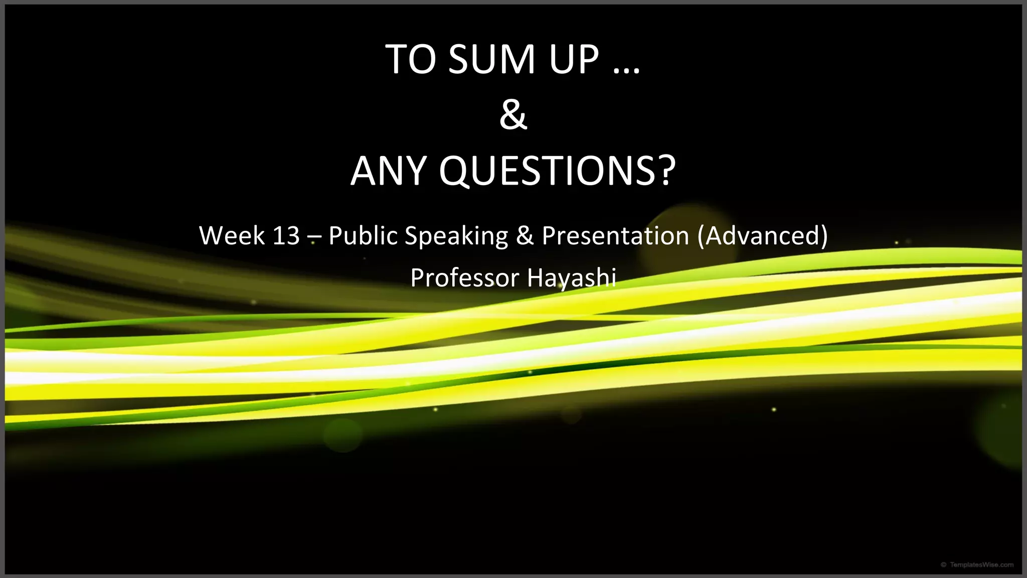 The document summarizes a class on public speaking and presentation skills. It provides expressions for concluding a presentation, summarizing main points, inviting questions, and techniques for conclusions like calls to action, stories, questions and quotations. It also includes exercises for students to practice their presentation and vocal delivery skills.