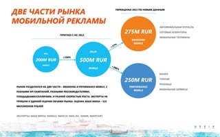 Документ представляет анализ рынка интернет-рекламы в России за 2012 год и прогнозы на 2013 год, показывая значительный рост сегментов, таких как дисплейная и контекстная реклама. Обсуждается влияние нововведений, таких как RTB, и подчеркивается значимость мобильной рекламы с ростом более чем на 150%. Вложенные данные также отражают динамику и предпочтения рекламодателей в разных сегментах, включая FMCG и финансовые услуги.