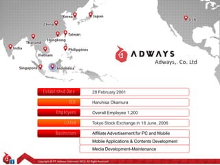 PT. Adways Indonesia is an affiliate marketing company established in 2001 with over 1,200 employees. It is listed on the Tokyo Stock Exchange and engages in affiliate advertising for PC and mobile, mobile app and content development, web development, and social media. The company describes affiliate marketing as a cost per acquisition model where advertisers pay publishers a commission for actions like registrations, purchases, downloads, and subscriptions that are driven from the publisher's website through the advertiser's links. PT. Adways Indonesia provides affiliate marketing services and analytics to both advertisers and publishers.