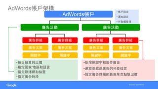 本文档提供了关于创建和管理Google AdWords账户的详细步骤,包括设定每日预算、选择国家和语言、配置广告活动和广告群组,以及设置访问权限和帐单信息。还包括了广告文案、关键词的管理和出价策略的选择。整个过程强调用户在创建广告时需要仔细确认各项设置,确保广告能正确投放。