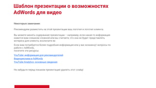 Документ представляет собой презентацию о возможностях использования AdWords для видео, включая размещение рекламы на YouTube и других площадках. Рассматриваются преимущества видеорекламы, форматы объявлений, создание каналов, а также способы оценки эффективности рекламных кампаний. В качестве ключевых аспектов подчеркиваются контроль бюджета, целевая аудитория и использование аналитики для оптимизации рекламы.
