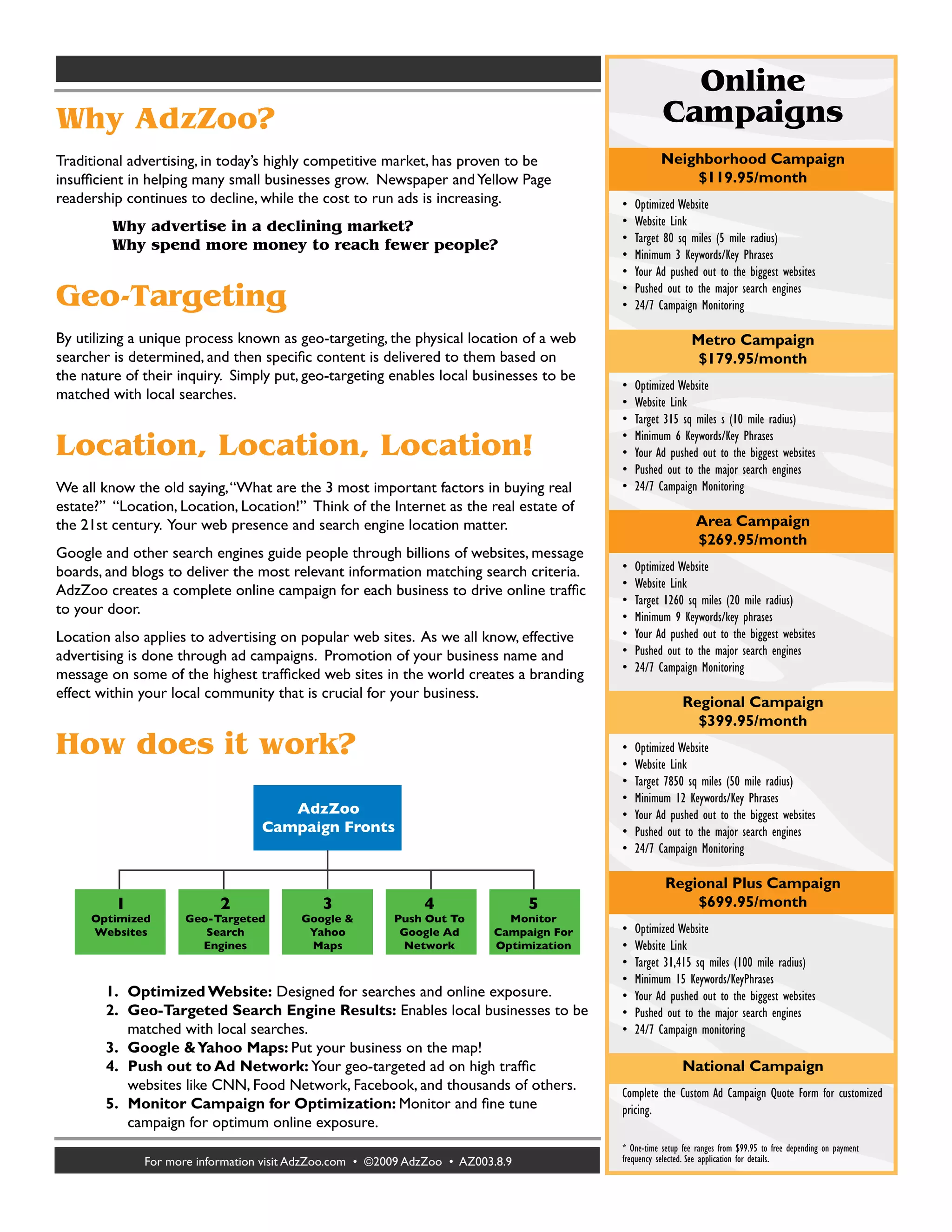 The document discusses how the Internet has changed communication and business by enabling global connection through tools like email, websites, and social media. While the Internet has benefited large businesses, it has negatively impacted local businesses by reducing the effectiveness of traditional advertising and causing consumers to perform more online searches. The document then introduces AdzZoo as a solution for local businesses, describing its geo-targeted online advertising campaigns that match local businesses with local searches across websites, maps, and search engines. AdzZoo guarantees top search placement and offers various campaign packages tailored to different geographical areas.
