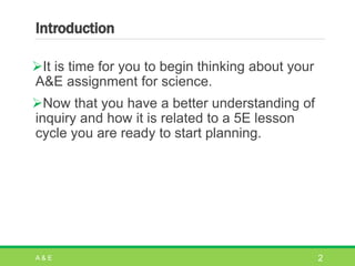 This document provides instructions for a science education assignment requiring teacher candidates to plan, teach, and assess a 5E lesson involving student inquiry. Candidates must create a full 5E lesson plan incorporating peer learning strategies. They will video record portions of the lesson implementation and assessments. Candidates will evaluate two peers' lessons and provide feedback. The goal is to demonstrate knowledge of creating inquiry-based science lessons using the 5E model that engage students in interactions and peer learning.