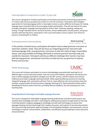 - Teaching English to Young Learners, which introduces techniques for teaching language to children ages 7-12.