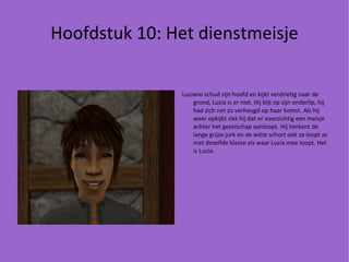 Hoofdstuk 10: Hetdienstmeisje Luciano schud zijn hoofd en kijkt verdrietig naar de grond, Lucia is er niet. Hij bijt op zijn onderlip, hij had zich net zo verheugd op haar komst. Als hij weer opkijkt ziet hij dat er voorzichtig een meisje achter het gezelschap aanloopt. Hij herkent de lange grijze jurk en de witte schort ook ze loopt ze met dezelfde klasse als waar Lucia mee loopt. Het is Lucia.