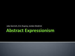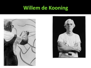 The document discusses Abstract Expressionism, an art movement that began in the 1940s in New York City. It involved spontaneous and emotional painting styles like action painting and color field painting. Key artists included Jackson Pollock, Willem de Kooning, Lee Krasner, and Mark Rothko. They reacted against traditional art and sought to directly express inner emotions, often dealing with trauma from World War II. Though critics were initially hesitant, it came to influence many later art movements.