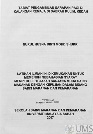 Kajian ini menilai tabiat pemakanan sarapan pagi di kalangan remaja di Kulim, Kedah, melibatkan 350 responden. Hanya 40% dari mereka dikenalpasti sebagai pengamal sarapan pagi yang tetap, dengan alasan utama pengambilan adalah pengaruh ibu bapa dan perasaan baik selepas sarapan. Kesimpulan menunjukkan amalan pemakanan sarapan yang kurang memuaskan dan perlunya peningkatan dalam pengambilan sarapan berkhasiat.