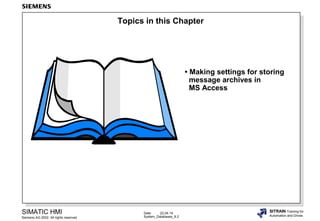 The document discusses storing message archives in ODBC databases, specifically MS Access. It covers making settings to store archives in MS Access, providing an example, and displaying the MS Access table where archives are stored. Topics include configuration settings for storing message archives in MS Access databases.