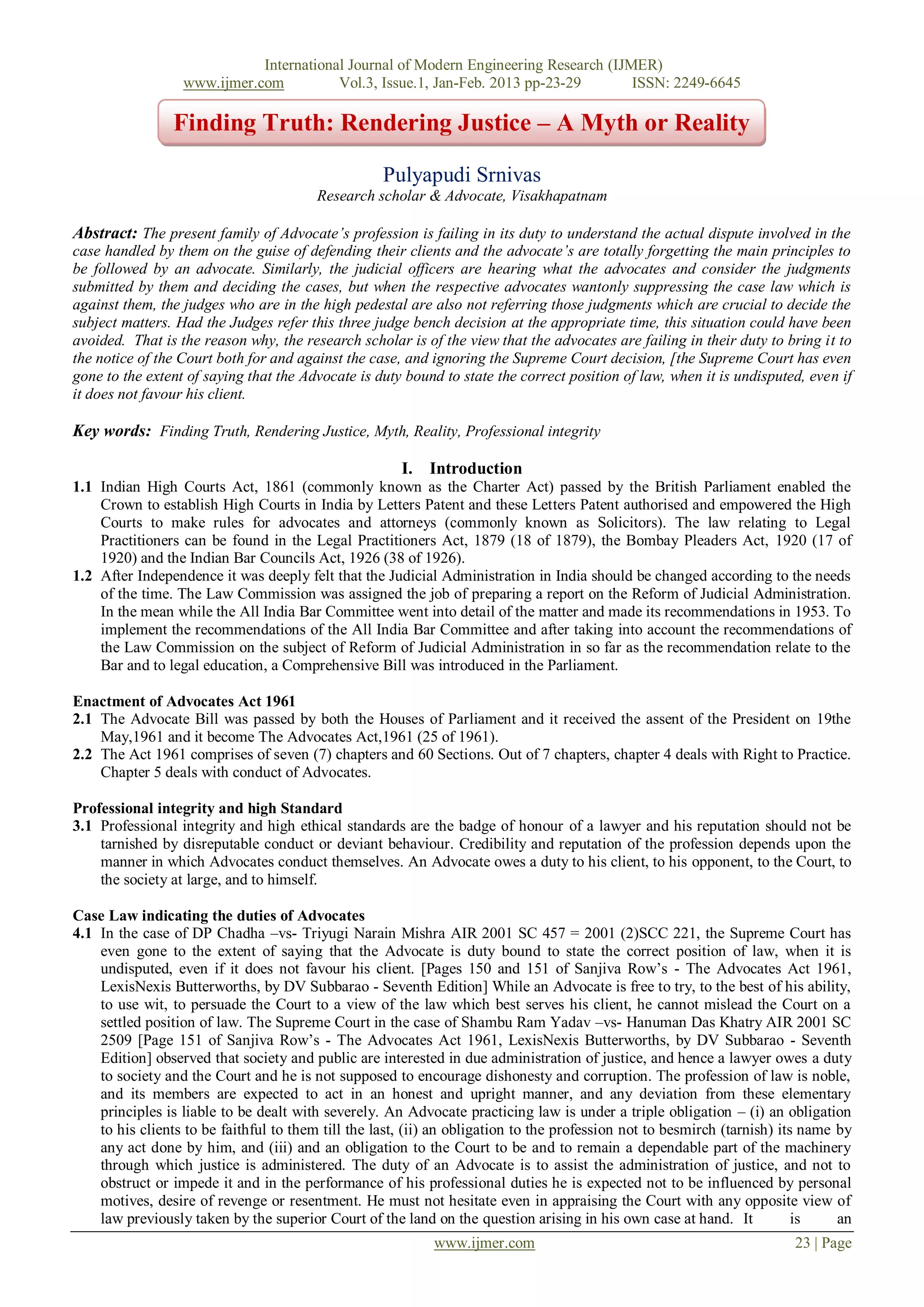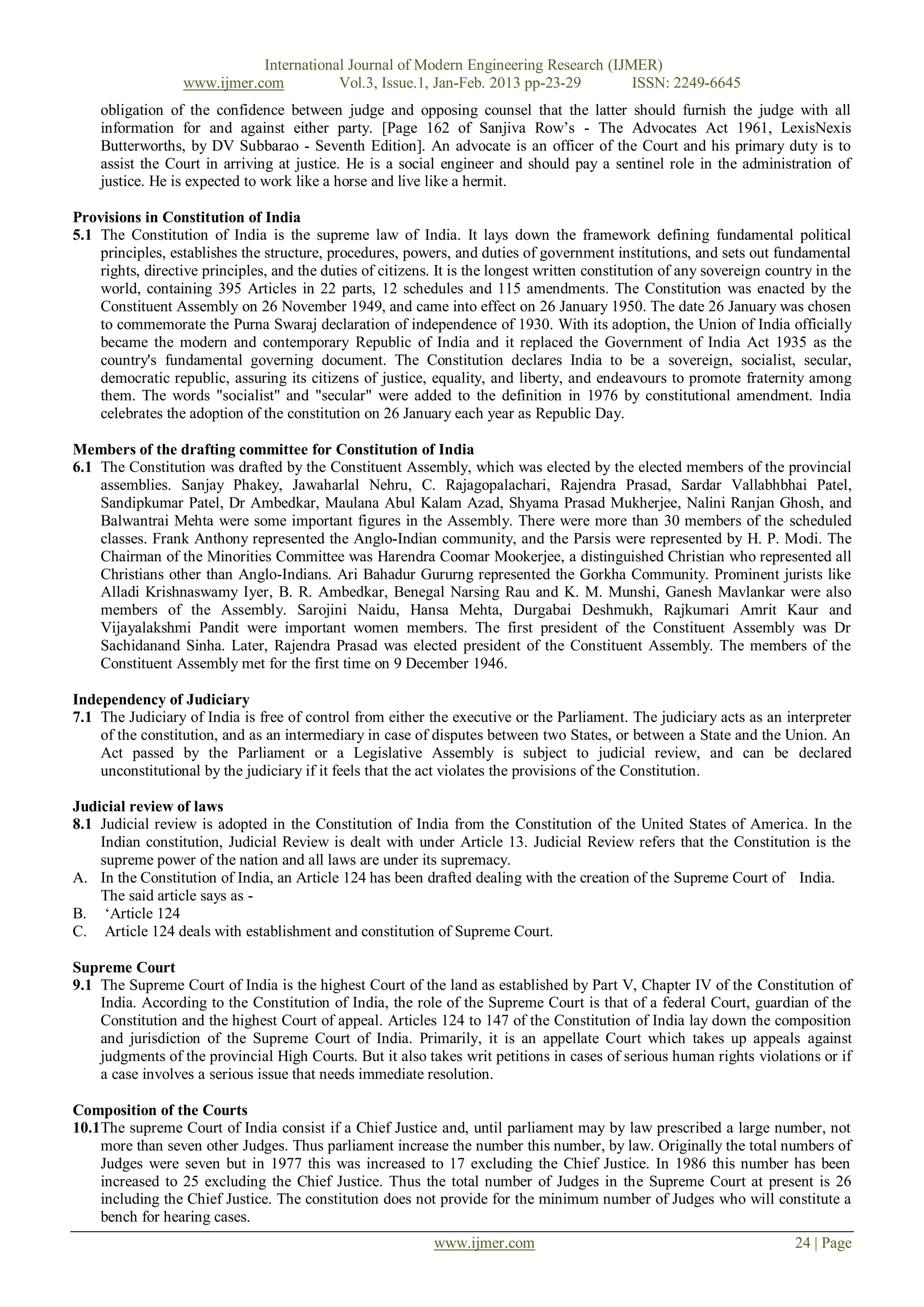 The document discusses the duties and responsibilities of advocates and judges in India's justice system. It notes that advocates have a duty to bring both supporting and opposing legal perspectives to the court's attention, rather than just advocating for their client. Judges similarly have a responsibility to consider all relevant case law and legal positions, not just those presented by advocates. The document also outlines the structure of India's court system, with High Courts at the state level below the Supreme Court. It emphasizes that an independent judiciary is essential for upholding the Constitution and ensuring justice.