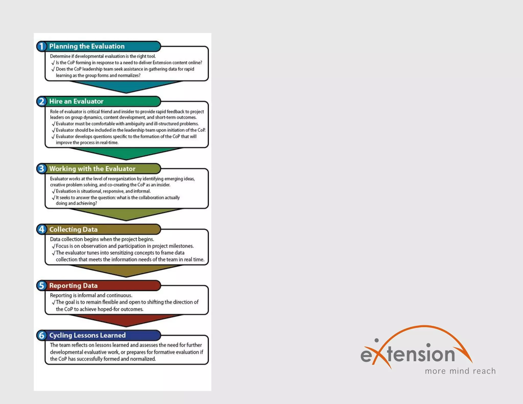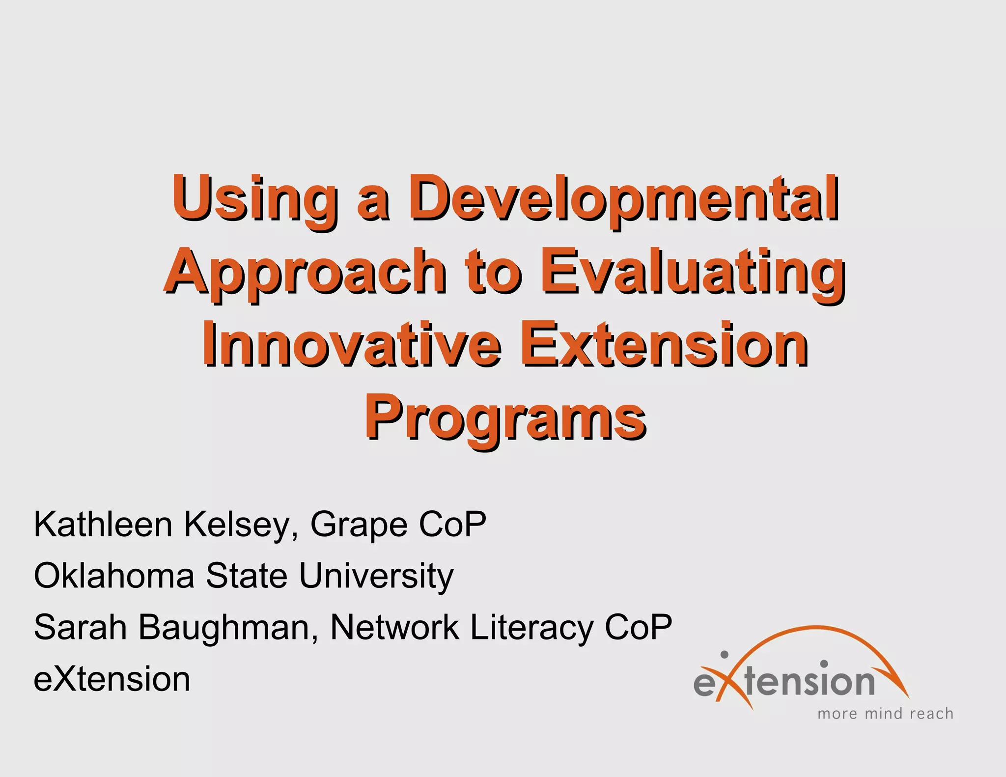 This document discusses using a developmental approach to evaluate innovative extension programs. A developmental approach involves ongoing adaptation of an intervention based on emerging outcomes and involves flexible evaluation methods. It discusses two extension programs, the Grape CoP and Network Literacy CoP, that used this approach. For both programs, leaders wanted a flexible evaluation process that allowed outcomes to emerge and change over time. The evaluators worked closely with program leaders, using informal reporting and conversations to provide continuous feedback and help programs adapt. This developmental approach helped programs address challenges and work towards broader impacts and system changes.