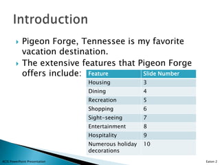 The document describes Pigeon Forge, Tennessee as the author's favorite vacation destination. It lists the extensive features Pigeon Forge offers, including housing, dining, recreation, shopping, sight-seeing, entertainment, hospitality, and holiday decorations. Photos and descriptions of the various housing, dining, and entertainment options in Pigeon Forge are provided. The author expresses a personal preference for smaller attractions like miniature golf over the larger Dollywood theme park. The hospitality of Pigeon Forge residents is highlighted as a key reason for the town's success and the author's repeated visits.