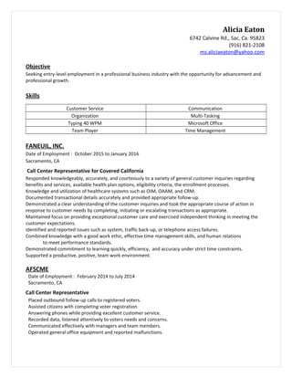 Alicia Eaton is seeking an entry-level position in a professional business with opportunities for advancement. She has over 10 years of customer service experience in call centers, retail, and pharmacy. Her experience includes responding to customer inquiries, data entry, and maintaining organized work spaces. She is proficient in Microsoft Office and has strong communication, organization, and time management skills.
