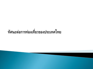 ประเทศไทยขาดคือเรื่องใด ในด้านการท่องเที่ยวคือ ร้อยละ ร้อยละ พัฒนาบริการและแหล่งท่องเที่ยว 31.9 พัฒนาบริการและแหล่งท่องเที่ยว 25.7 การประชาสัมพันธ์การท่องเที่ยวไทย 27.8 เพิ่มการรักษาความปลอดภัย 24.0 เพิ่มการรักษาความปลอดภัย 12.6 การประชาสัมพันธ์การท่องเที่ยวไทย 17.7 การอานวยความสะดวกในการเข้า ความสะอาดของแหล่งท่องเที่ยว 6.9 ประเทศของนักท่องเที่ยวต่างชาติ 11.1 การพัฒนาการคมนาคมขนส่ง 6.3 การส่งเสริมและพัฒนาบุคลากรด้าน สิ่งอานวยความสะดวกในสถานที่ท่องเที่ยว 4.8 การท่องเที่ยว 7.6 อื่นๆ เช่น การพัฒนาบุคากร/การอนุรักษ์ อื่นๆ เช่น ดูแลรักษาแหล่งท่องเที่ยว/ ทรัพยากรธรรมชาติ เป็นต้น 14.9 สิ่งแวดล้อม เป็นต้น 9.1 17