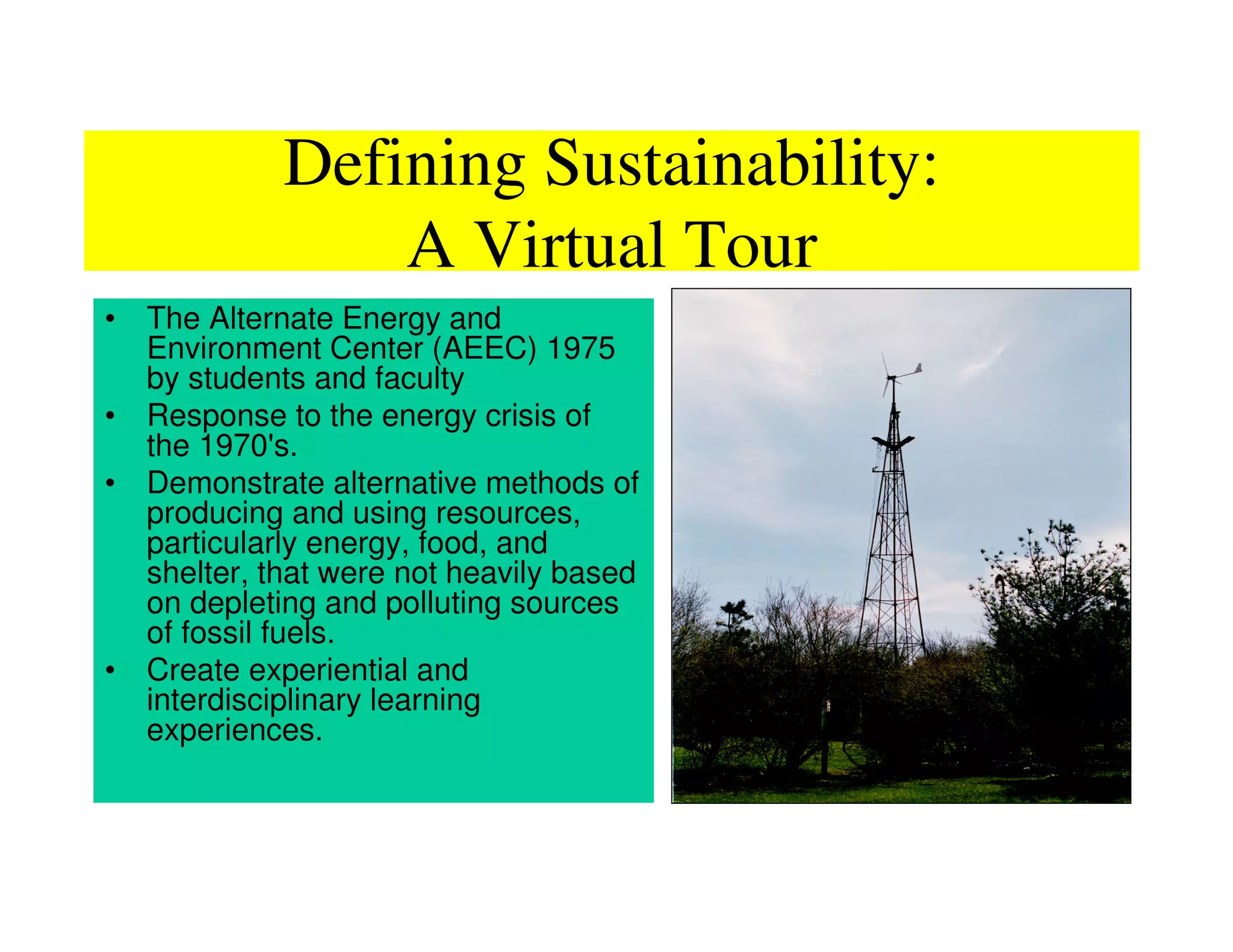 The document outlines the AEEC's educational initiatives focused on sustainability, promoting alternative energy, food production, and resource conservation in response to the 1970s energy crisis. It emphasizes experiential learning, community involvement, and the integration of ecological principles for long-term environmental health. Key topics include passive solar design, waste management, and the importance of collective action in achieving sustainability.