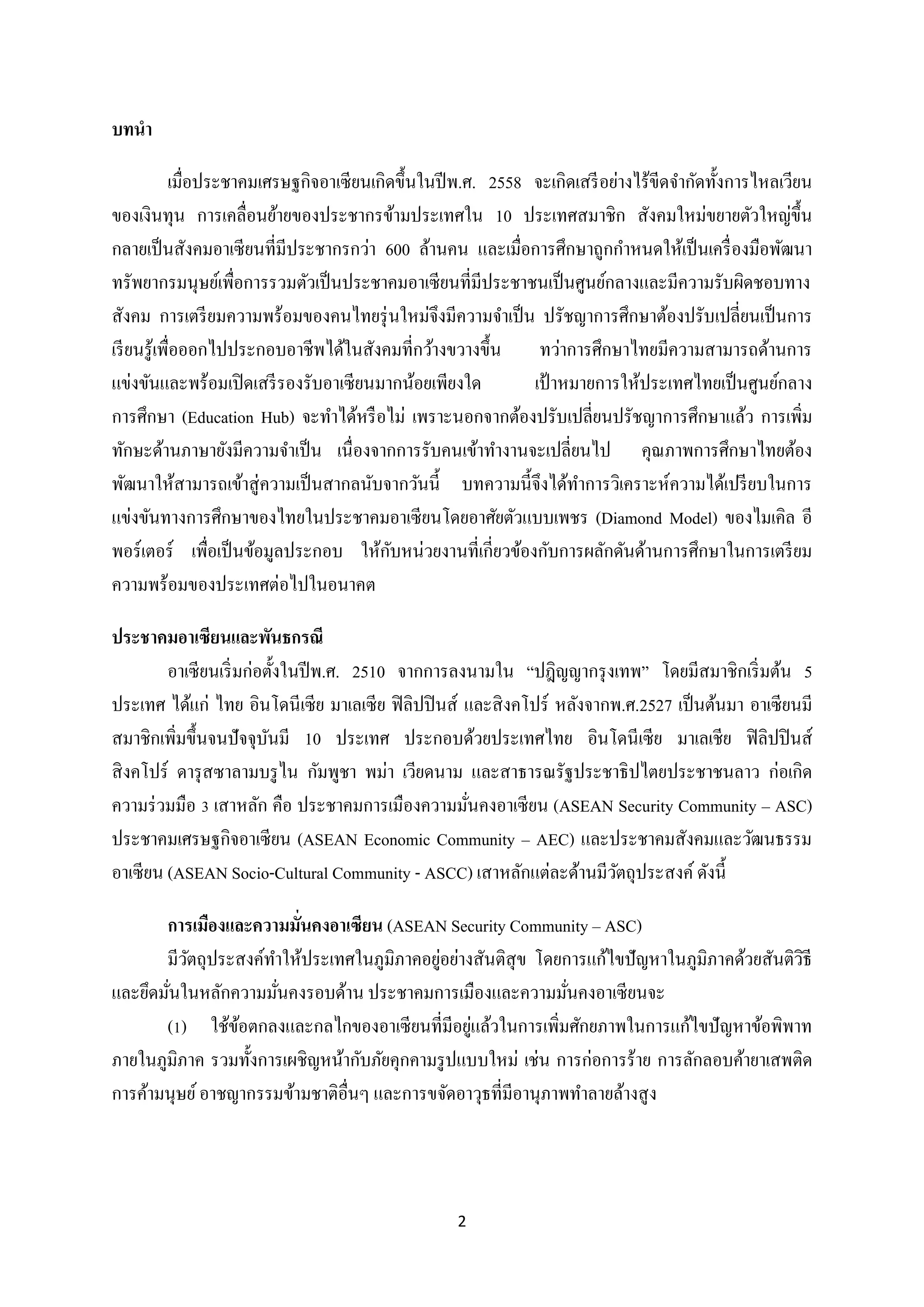 อาเซียน เมื่อวิเคราะห์ความได้เปรี ยบในการแข่งขันของการศึกษาไทยด้วยตัวแบบเพชรของไมเคิล อี พอร์