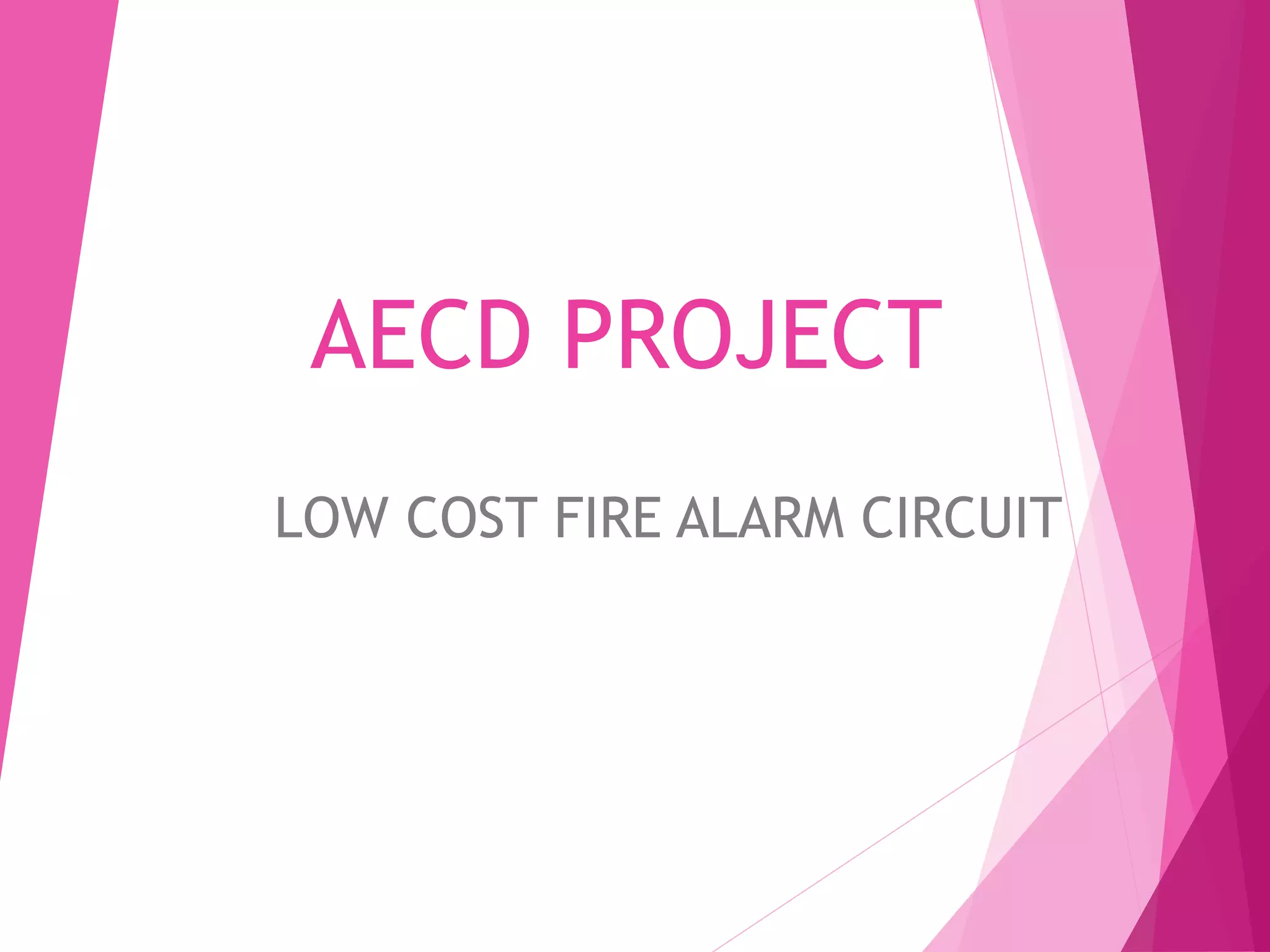 This document describes a low cost fire alarm circuit project. It includes an introduction to fire alarms and their importance. The circuit uses transistors as heat sensors to detect a fire and trigger a relay connected to alarms. When the temperature rises, the leakage current of one transistor increases, biasing a second one on and activating the relay. The circuit provides fire detection at low cost with simple components and circuitry. It has advantages of low price, ease of use and portability but cannot detect extremely high temperatures. The summary aims to capture the key purpose, components, working and benefits of the circuit in 3 sentences or less.