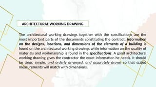 Architectural working drawings and specifications are crucial parts of contract documents, providing essential information on building design, materials, and workmanship. These detailed drawings guide contractors, ensuring accurate measurements and clear communication for construction. The document outlines the various types of sheets involved in working drawings, emphasizing their importance in the planning and execution of residential projects.