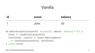 This document presents Aecor, a framework for purely functional event sourcing, detailing its toolkit, modular architecture, and relational behaviors. It includes a comprehensive overview of event handling through operations like debiting accounts, managing events, and processing in a distributed environment. Additionally, it highlights advantages such as scalability, composability, and applications in asynchronous processing and event-based service integration.