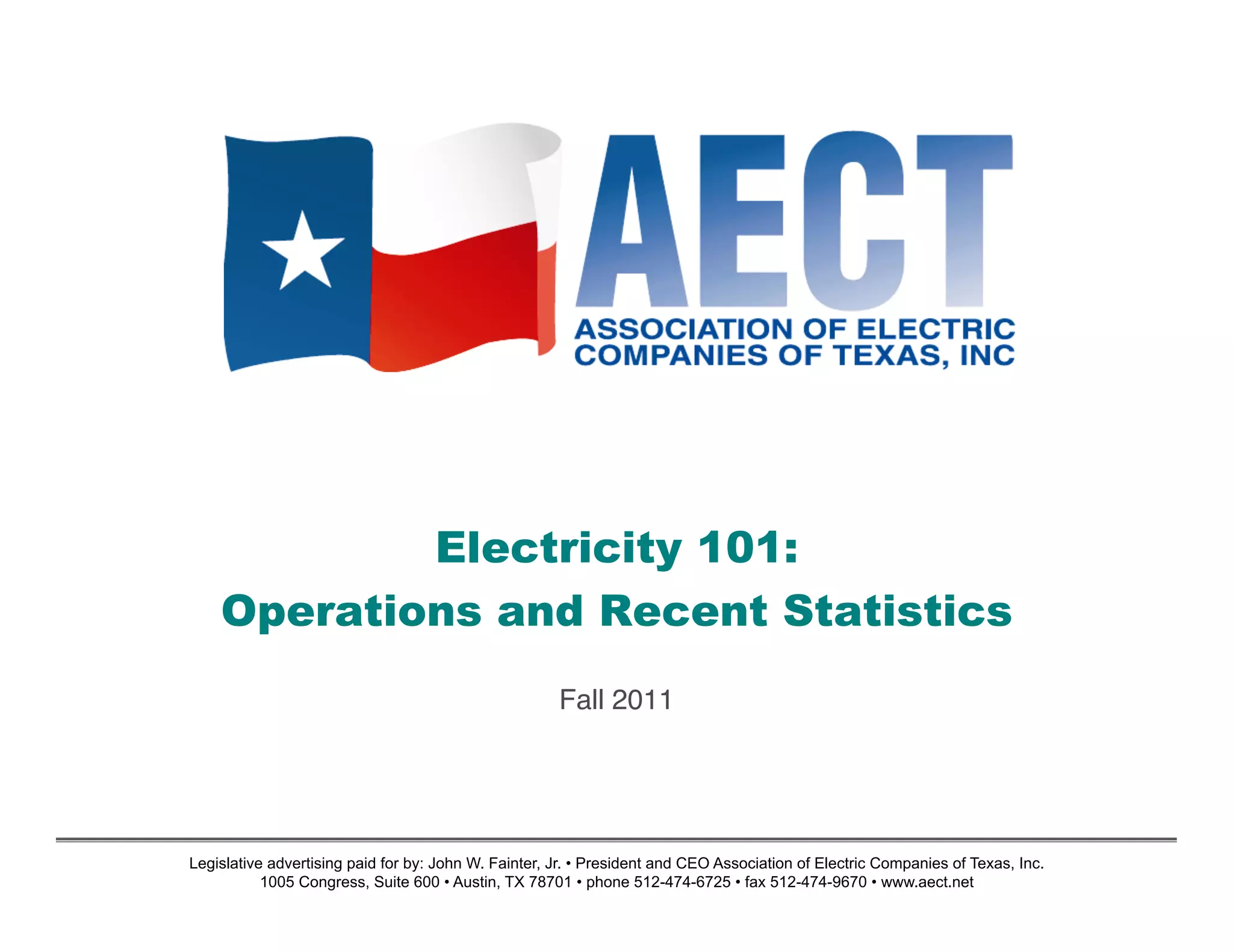 The document provides an overview of the electric industry in Texas, including the members of the Association of Electric Companies of Texas (AECT). AECT members include electric generation companies, transmission and distribution utilities, and retail electric providers. The document discusses the different types of AECT member companies and their roles in electricity operations in ERCOT and other regions of Texas.