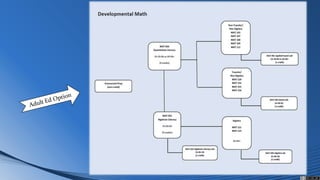 This document provides an overview of Colorado's redevelopment of developmental education. It notes that traditional developmental education sequences have high attrition rates that present structural barriers to students completing college-level courses. The redesign aims to accelerate students through redesigned math and English pathways and integrated support services to help more students successfully complete college-level courses. It outlines the new models for College Composition and Reading courses and soft landing options to better prepare students to retake placement exams. The goal is to reduce time, credits and courses needed in developmental sequences and better support student success in college-level work.