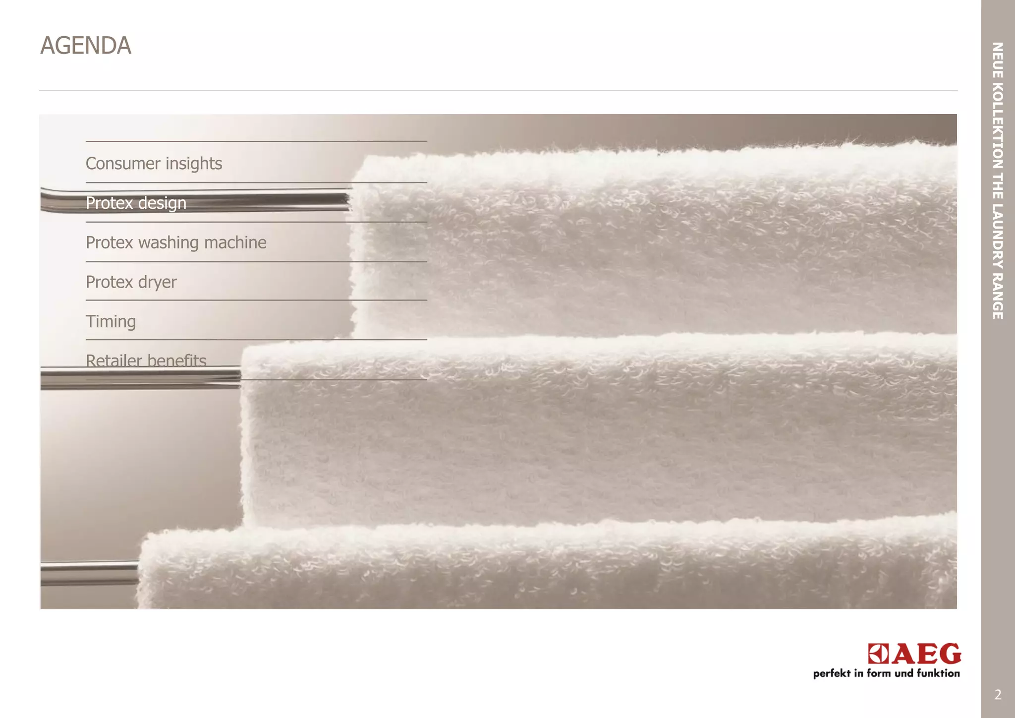 This document provides an agenda and details for a trade presentation on a new laundry appliance range called Protex. The agenda includes sections on consumer insights, the Protex washing machine and dryer designs, benefits for retailers, and timing for the product launch. Details are given on the washing machines and dryers, including features, models, energy efficiency, capacities, and benefits compared to previous lines. The goal is to showcase the new Protex range's gentle and efficient cleaning performance.