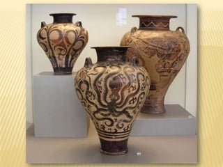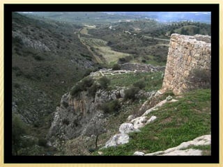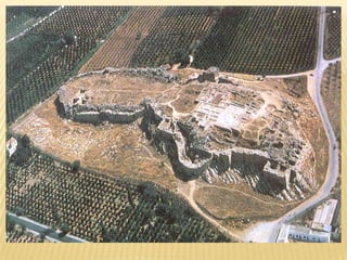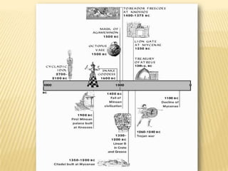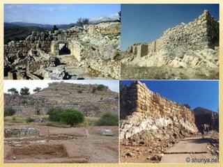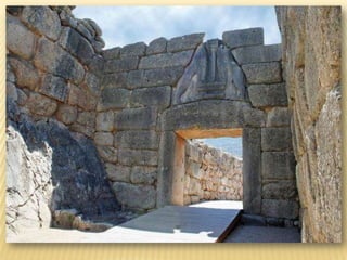 - The Mycenaean civilization dominated from around 1500 BC, adopting the Minoan Linear A script and burying nobles in beehive tombs with treasures. They built citadels like Mycenae protected by monumental gates.