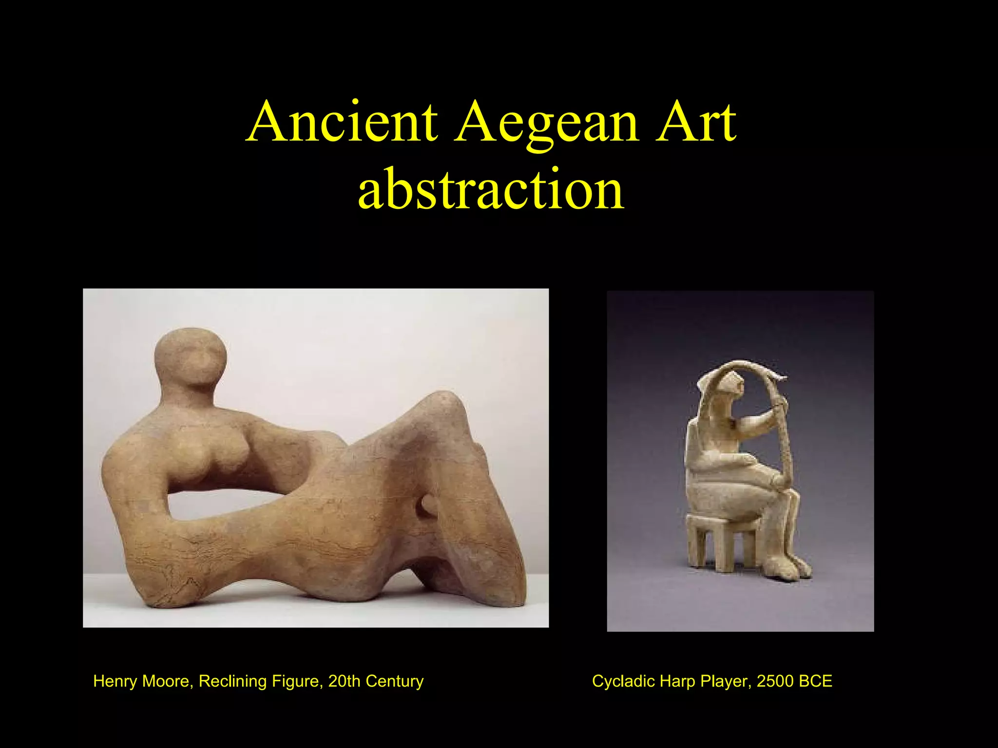 The document summarizes Aegean art from the Bronze Age civilizations of the Cyclades islands, Minoan Crete, and Mycenaean Greece between 3000 BCE to 1000 BCE. It describes Cycladic marble sculptures, Minoan palace architecture and frescoes at sites like Knossos depicting natural scenes and rituals. Metalworking and pottery featured marine designs. Mycenaeans later dominated the region and constructed fortified citadels and beehive tombs, as described in Homer's epics. Significant artworks uncovered include the Bull Leaping fresco and Mask of Agamemnon.