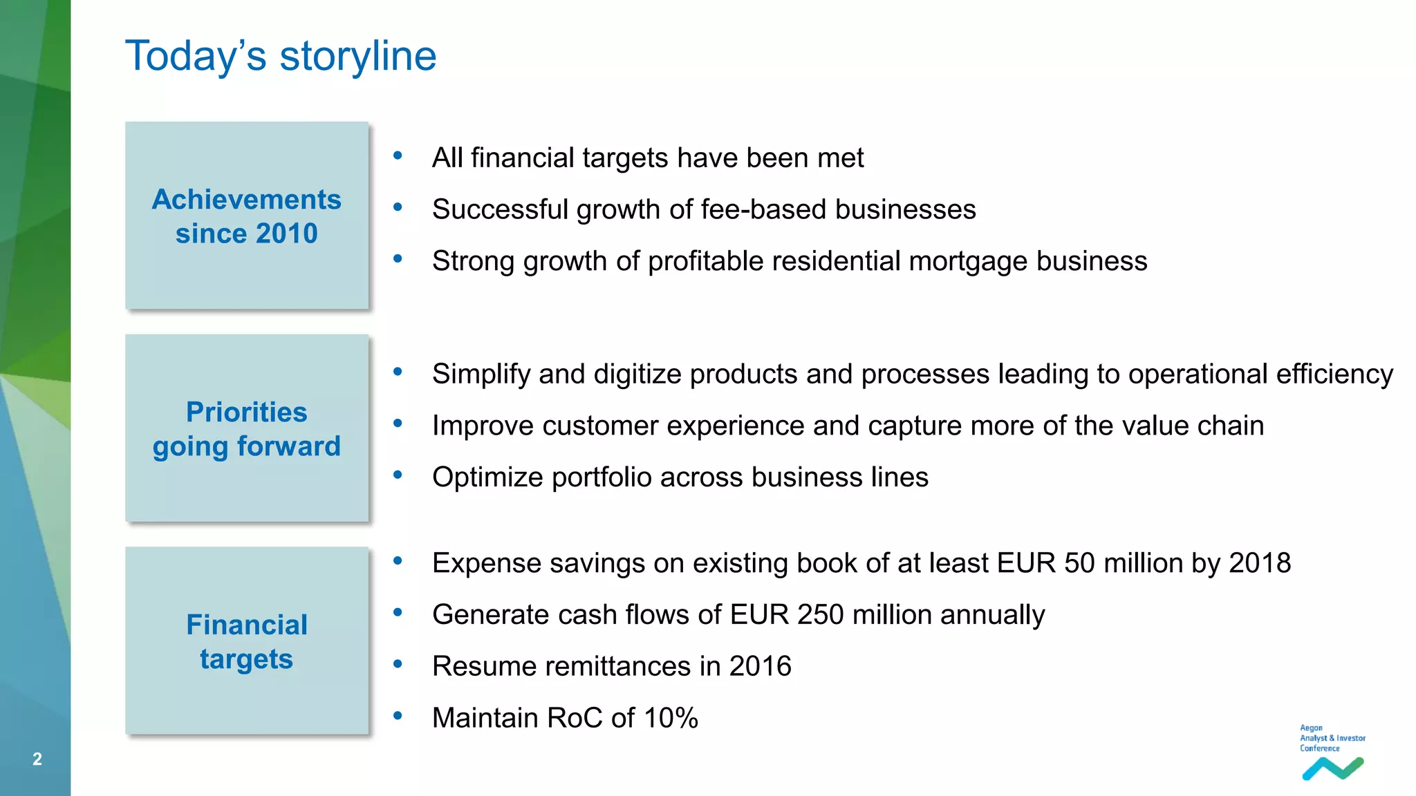 - Priorities going forward include simplifying and digitizing products/processes, improving customer experience, optimizing portfolios, reducing expenses by EUR 50 million by 2018, and generating annual cash flows of EUR 250 million.