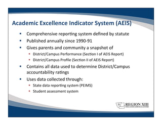 This document provides an overview and summary of the Academic Excellence Indicator System (AEIS) annual report for Georgetown ISD for 2010-11. The AEIS is a comprehensive reporting system defined by statute that gives parents and the community a snapshot of district and campus performance and profiles. Key data in the AEIS includes TAKS performance rates, attendance, dropout rates, completion rates, and college readiness indicators. The document reviews accountability standards and indicates that for 2011, Georgetown ISD and several of its campuses met the standards for Recognized or Exemplary ratings while others were Academically Acceptable. Specific student performance data is also presented.