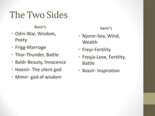 The document summarizes the Aesir-Vanir war between the two groups of Norse gods. The Aesir, led by Odin, used weapons and combat, while the Vanir, led by Njord and including Freyja, used magic. The war lasted a long time with both sides gaining the upper hand. Eventually a truce was called and it was agreed that Freyja, Freyr, and Njord would join the Aesir, while Hoenir and Mimir would join the Vanir. However, the Vanir killed Mimir, feeling cheated. In the aftermath, the groups created Kvasir, the wisest being, to sustain a pledge of harmony between