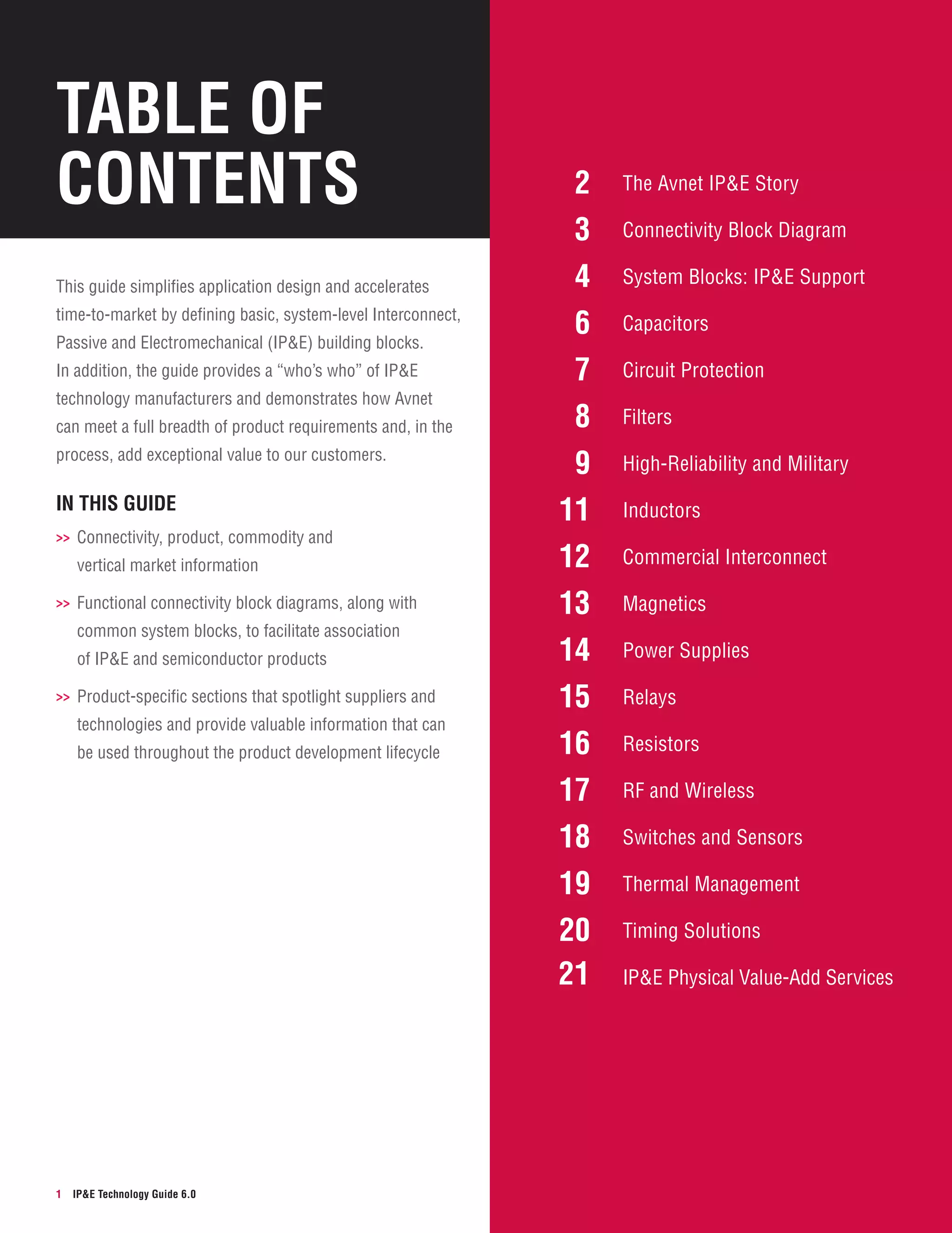 The IP&E Technology Guide provides essential information on interconnect, passive, and electromechanical products to facilitate design and accelerate time-to-market. It outlines Avnet's capabilities, supplier partnerships, and a wide range of products and services available, while emphasizing their commitment to customer support and inventory management. The guide also includes detailed descriptions of system blocks, application-specific products, and various value-added services to assist throughout the product development lifecycle.