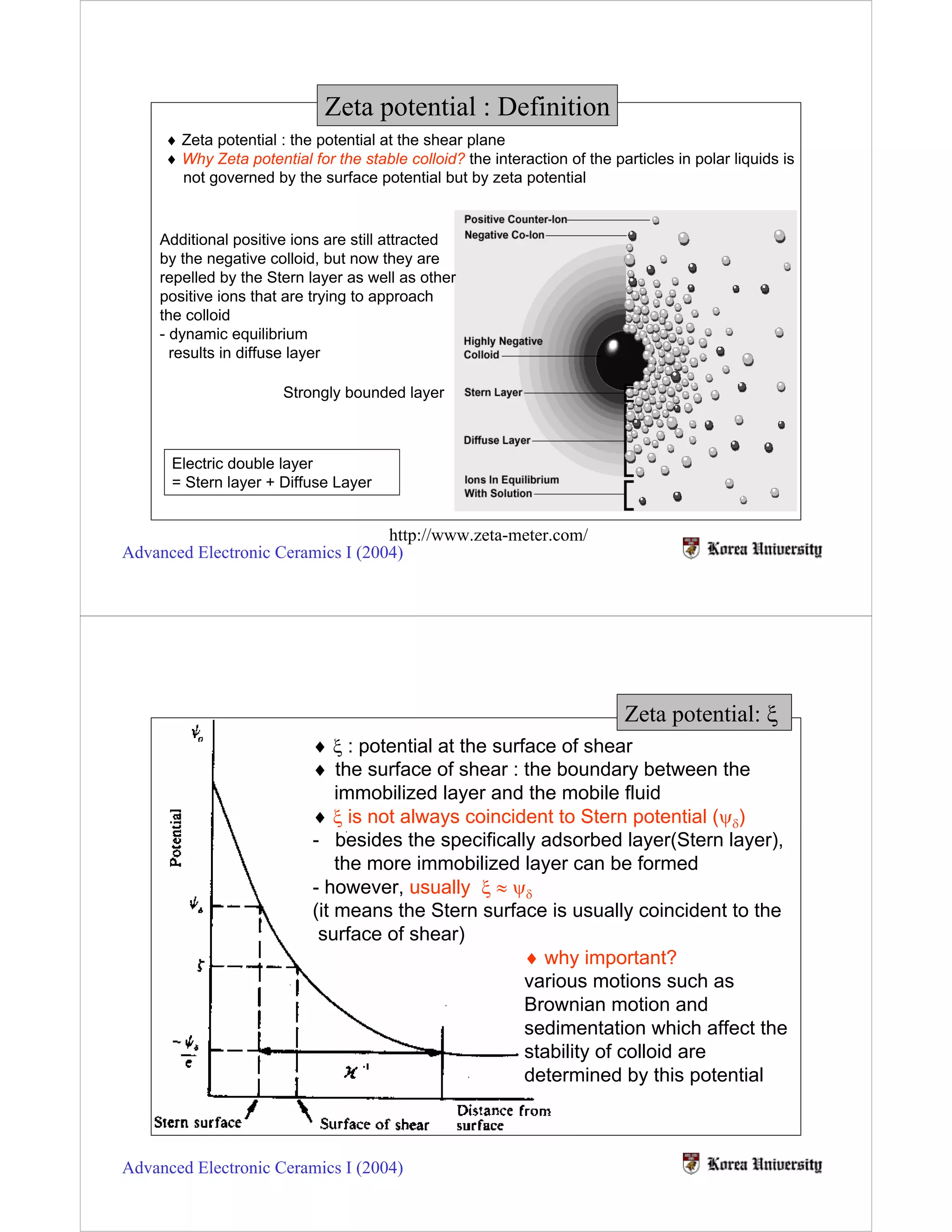 Zeta potential refers to the electric potential at the boundary between the stationary layer of fluid attached to a particle's surface and the mobile fluid layer. It is important because various motions that affect colloid stability, like Brownian motion and sedimentation, are determined by zeta potential rather than surface potential. Zeta potential can be measured using electrophoresis - by applying an electric field to observe particle migration - or laser Doppler velocimetry. Measurements of zeta potential are used in applications like sewage treatment, paints, printing inks, and monitoring flocculation.