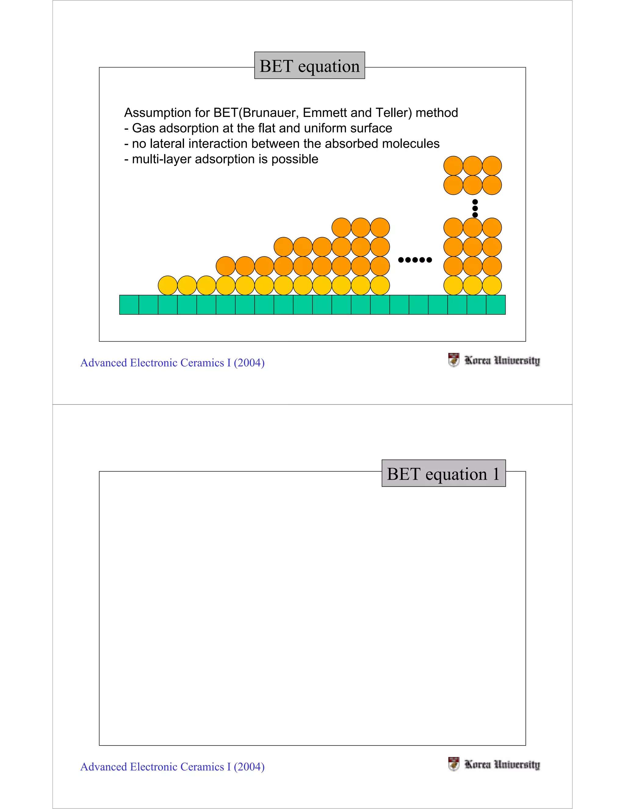 The BET method makes three main assumptions about gas adsorption: 1) it occurs on a flat, uniform surface; 2) there is no interaction between adsorbed gas molecules; and 3) multi-layer adsorption is possible. The BET equation relates the volume of gas adsorbed at a given pressure to the volume required for monolayer coverage and the saturation pressure of the gas. BET analysis uses an adsorption isotherm from multiple pressure points to calculate the specific surface area of a material. It is most accurate for surfaces that are flat and uniform with a consistent heat of adsorption for each layer.