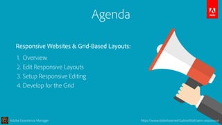The document discusses Adobe Experience Manager's capabilities for responsive web design. It provides an overview of responsive vs adaptive design and outlines AEM's features for editing responsive layouts through a grid system. The presentation covers how to enable responsive editing in AEM, including setting up breakpoints and using the responsive paragraph system. It also provides examples of how to leverage the grid for layouting, floating, breaking, nesting and hiding content across breakpoints.