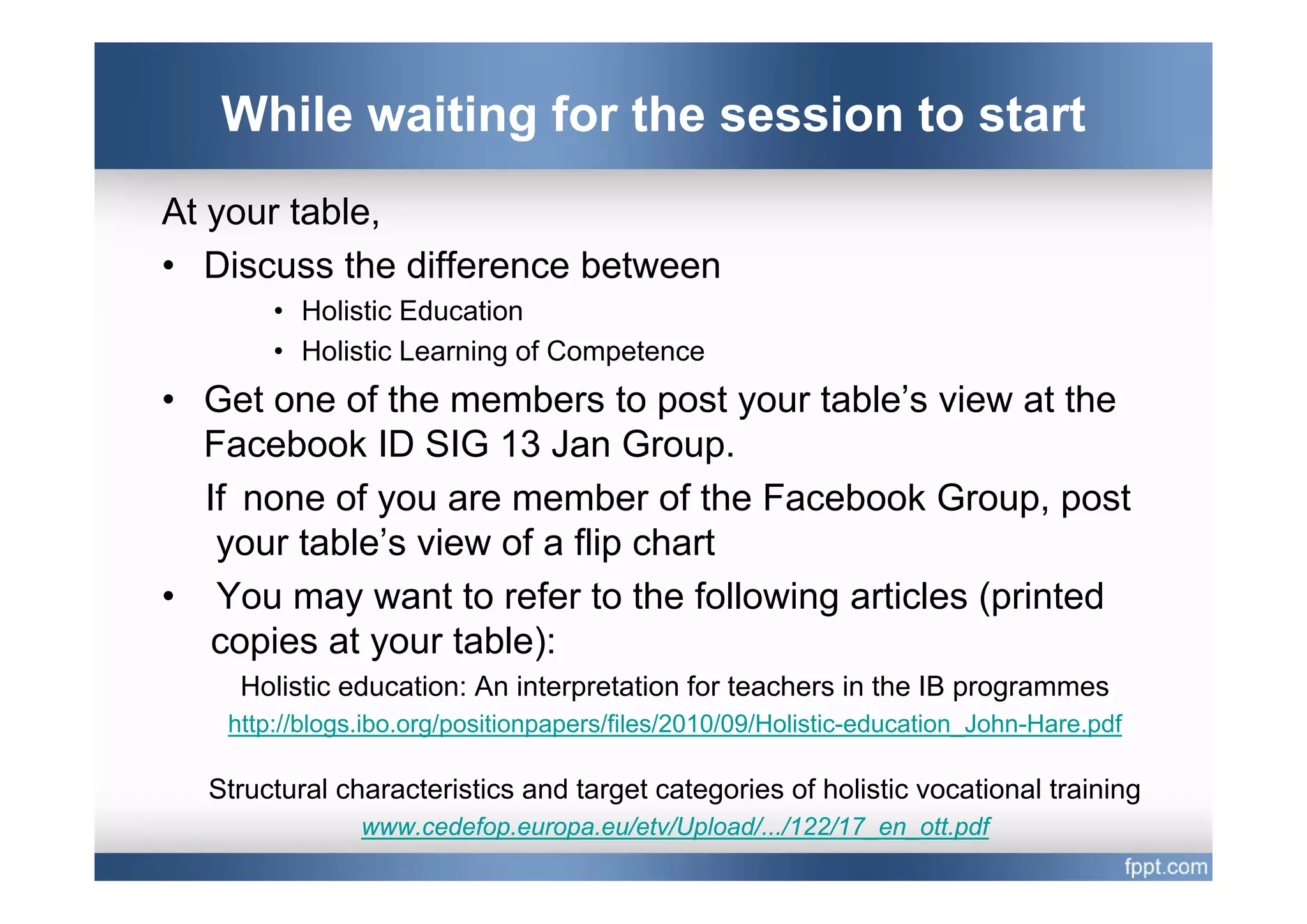 This document provides an overview of a presentation on using a whole task approach to holistic learning of vocational competences. It begins with discussing the differences between holistic education and holistic learning of competence. It then explains why holistic learning of competence is important from theoretical, practical, and brain-based perspectives. The presentation goes on to describe the whole task approach, including using real-world tasks to situate learning, identifying the knowledge, skills, attitudes and personal competence to be learned for each sub-task, and considering instructional design processes like task analysis.