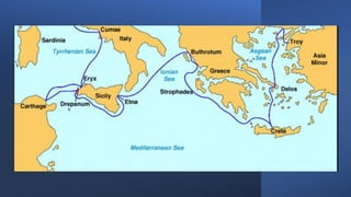This document summarizes the journey of Aeneas after the fall of Troy. It describes how Aeneas escaped Troy carrying his father on his back and refused offers to stay, instead traveling west with other Trojans. The Trojans encountered obstacles like monsters and competed in Greece before Aeneas received a prophecy about settling in Italy. There, Aeneas founded the city of Lavinium and later died, with his descendants founding Rome. The document traces the mythology that connected Aeneas to the founding of Rome.