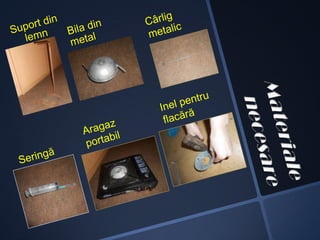 Documentul descrie diverse componente din cupru utilizate în procesele de gătit și experimentare. Acestea includ o tijă cu cârlig, un suport pentru cârlig și bilă, precum și o seringe pentru apă. De asemenea, se menționează un inel destinat focalizării flăcării.