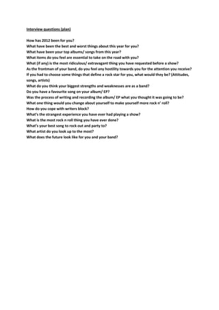 This interview plan contains questions about the interviewee's year, favorite music from 2012, essential items they take on tour, any extravagant tour requests, how they cope with attention as the frontman of their band, what defines a rock star to them, their band's strengths and weaknesses, their favorite song from their album/EP, the recording process, how they deal with writer's block, strangest show experiences, most rock n roll moment, best party song, artist they look up to most, and their band's future plans. The questions provide insight into the interviewee both personally and professionally as the leader of their musical group.