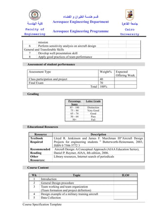This document outlines the course specifications for an Aircraft Design course, including the course aims to introduce aircraft design methodology and develop skills in designing an aircraft to meet mission requirements, assessment breakdown as 40% class participation and project and 60% final exam, and intended learning outcomes for students to gain knowledge and skills in aircraft conceptual design and performance analysis.