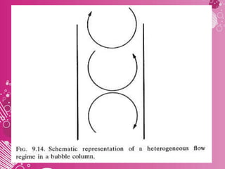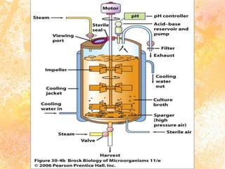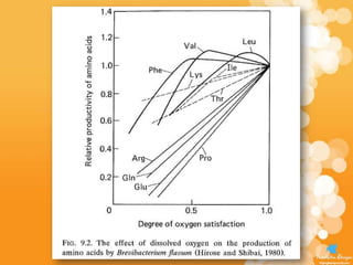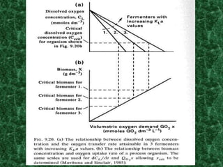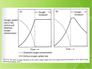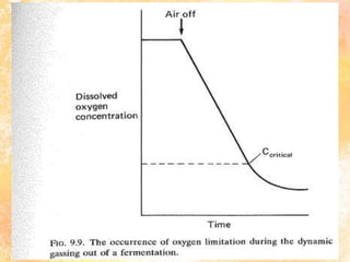 This document discusses aeration and agitation in fermentation processes. It describes how oxygen is supplied to microbial cultures through aeration, which involves bubbling air through the liquid or agitating the liquid to increase oxygen absorption. Key factors that influence oxygen transfer rates include the agitator, baffles, aeration system, dissolved oxygen concentration, volumetric mass transfer coefficient (KLa) of the fermenter, and oxygen demand of the microbial culture. Methods for determining the KLa value include the sulphite oxidation technique and gassing out techniques.