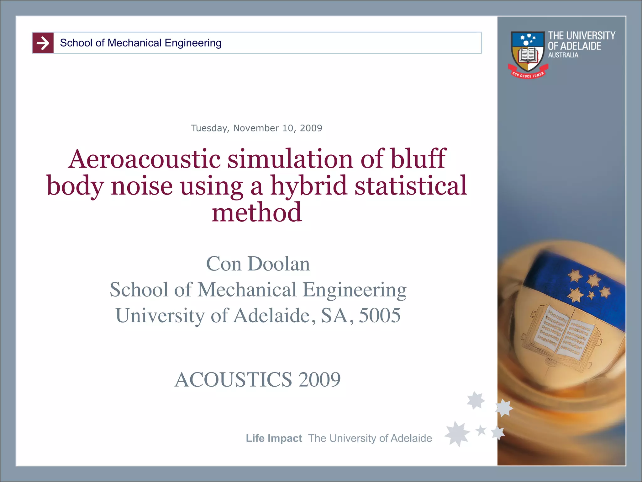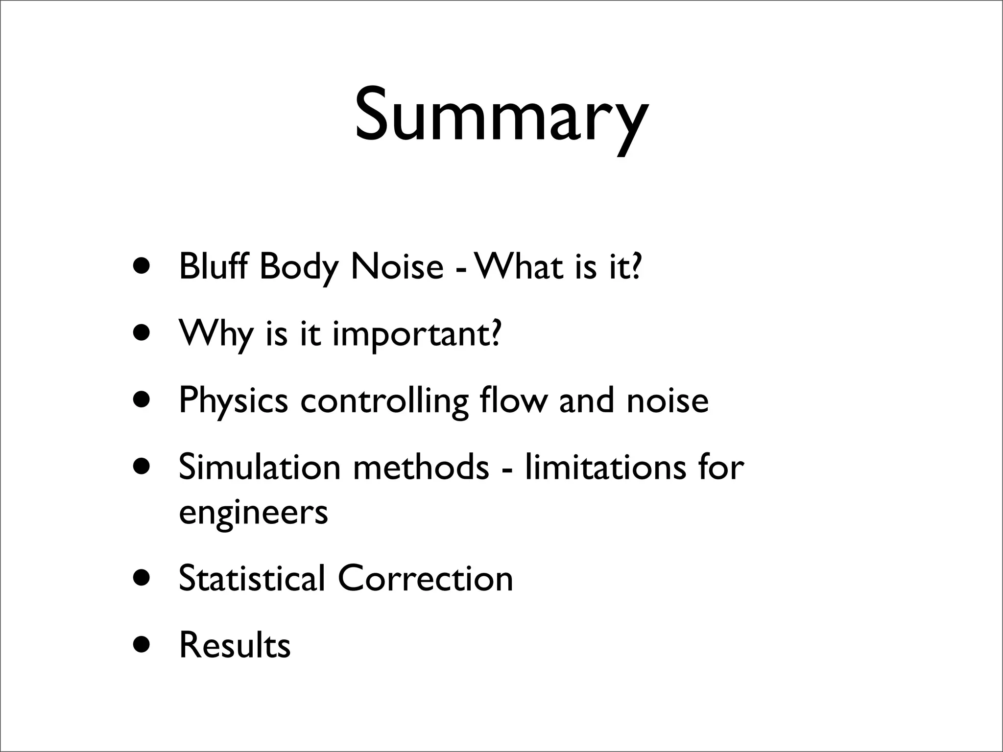 The document summarizes a presentation on aeroacoustic simulation of bluff body noise using a hybrid statistical method. It discusses limitations of conventional computational fluid dynamics methods for noise prediction and introduces a new statistical correction method to improve noise simulation results from unsteady Reynolds-averaged Navier Stokes simulations. Key results from applying the statistical correction to simulations of circular cylinder noise are also summarized.