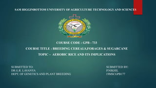 Aerobic rice is a production system where rice varieties are grown in well-drained, non-puddled soils without standing water throughout the season. This aims to use 70-80% less water than flooded rice while still achieving yields of 4-6 tons per hectare. Aerobic rice was developed by IRRI to address water scarcity issues while increasing food production. It uses nutrient-responsive varieties adapted to aerobic conditions and supplemental irrigation. Compared to traditional flooded rice, aerobic rice uses 55-56% less water and has 1.6-1.9 times higher water productivity, making it suitable for areas with insufficient water for flooded rice.