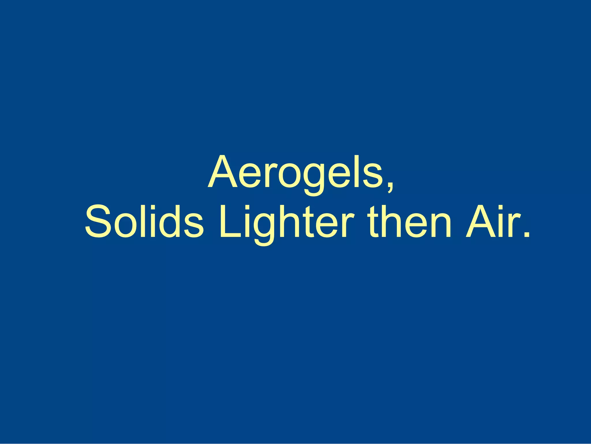 Aerogels are solid materials that are lighter than air. They were first created in 1951 and have excellent insulating properties despite their sparse molecular structure. Aerogels are difficult and expensive to manufacture traditionally but production processes have been streamlined. Aerogels have numerous applications such as capturing space dust for NASA, insulating the Mars Rover, and providing insulation for divers.
