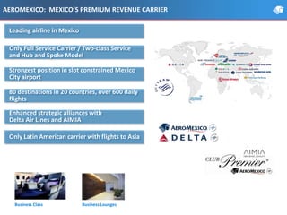 Aeromexico is Mexico's leading airline and only full-service carrier. It has the strongest position in Mexico City airport with over 600 daily flights to 80 destinations in 20 countries. Aeromexico has a hub-and-spoke model and strategic alliances with Delta and AIMIA. It focuses on strengthening its network connectivity, securing its position in Mexico City through upgauging, and solidifying its position with a new shuttle product. Aeromexico also aims to maximize revenue through yield management, ancillary fees, and merit a premium over competitors due to its full-service model. It has strong financial performance through cost reduction initiatives and fleet renewal to reduce ownership costs. Aeromexico is well positioned for continued growth