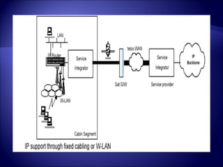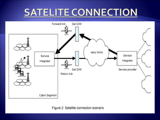 The document discusses providing wireless connectivity services like UMTS, WLAN, and Bluetooth to passengers on aircrafts. It proposes using a satellite connection to allow passengers to access these services during flights by connecting the aircraft cabin to terrestrial networks via satellite. Key aspects covered are the different wireless standards that would be used within the cabin, integrating these services, and using satellites to enable global connectivity for aircrafts in flight.